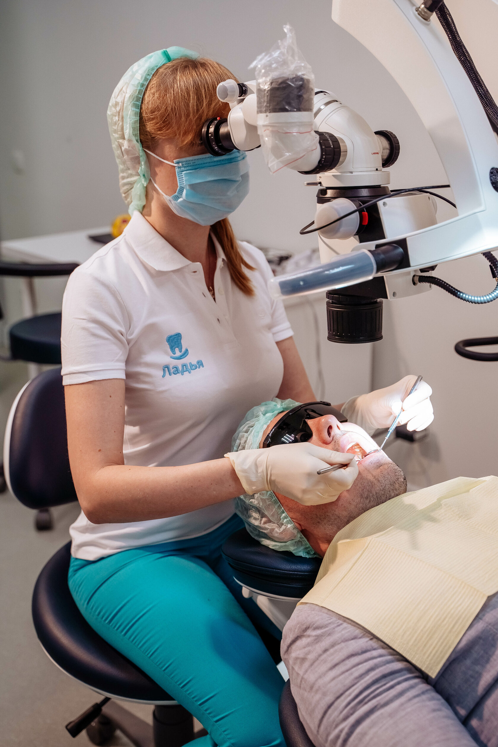 Для лечения корневых каналов зубов в нашей клинике используется операционный микроскоп. Использование микроскопа при лечении зубов – это передовая стоматологическая методика. Благодаря ей врач получает возможность осуществлять очень сложные манипуляции в корневых каналах и значительно повышает точность своих действий. Благодаря микроскопу стоматолог может в мельчайших подробностях рассмотреть анатомические особенности каналов зуба и визуально проконтролировать качество пломбирования. В клинике «Ладья» мы используем операционный микроскоп «Labomed» производства США.